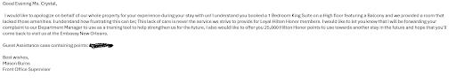 I am writing in to explain to you my experience at Embassy suites hotel in New Orleans. Two days prior to my arrival i contacted Embassy suites of New Orleans to confirm that I would be able to split my payment at check in and was told that it was possible. Being that I am a Hilton Honors member and an Amex Hilton Honors card holder, I ALWAYS use my Amex card when staying at Hilton hotels so that I am able to maximize my Hilton Honors points. Unfortunately, however my AMEX card has a limit of $1000, hence why I wanted to split my payment between two cards, because the room itself at Embassy Suites of New Orleans was a total of $1600. Being that I was told two days prior to my arrival that this was possible, I paid off my Amex card to a zero balance as well as paid off my secondary card to assure funds would be there. When I arrived at Embassy suites of New Orleans, July 2,2024, I went to check in. I checked in with Sakira, who refused to split my payment on two cards as planned. I explained to her that I called prior to coming and was told that I could split payments, but she continued to say that it was not possible when checking in and that I could only do it when I check out. Therefore, this resulted in me having to pull more money out of my personal checking account (which was money for my bills & rent), to be able to pay off ANOTHER credit card to gain access to my room. This was VERY UNEXPECTED AND INCONVENIENT because now I am tapping into money that is needed for bills. After checking in, I proceeded to my room. My room itself was very outdated and unclean. The bathtub had standing water, and I immediately reported it and the plumber came up there and pretty much just looked at it and left and did not repair anything. My friend, Darvece Monson arrived a few hours after me and is my witness to all that took place at this hotel. The next morning, Darvece and I went to the front desk to see about changing rooms. The second room we got was just as bad. The sink in the bathroom had standing water, the telephone was broke to where we could not call downstairs, and one of the lightbulbs on the ceiling fan was blown. After noticing all this, we went downstairs and spoke with Linda. Linda did help by refunding a portion of our money back onto my card as well as collecting the split payment and putting it on the two cards that I intended to use and refunded my $1765 back to my Amex Business card. Linda also gave us a $300 credit back to my account. Linda also confirmed that it was possible to do a split payment when checking in and that I was lied to. However, today, June 10, 2024 the funds are still NOT AVAILABLE on my Business Amex card and when I contacted American Express two days ago, they told me that the charge of 1765 was still pending. Not only was this hotel a horrible experience but we also paid for a late check out and we were kicked out of our hotel room around 12 noon when we were guaranteed that we could stay there until 2 PM. During the whole kick out process, my friend and I were at the convention center, enjoying the essence festival when we got a phone call from my daughter, saying that we were being kicked out of our room. The girl at the front desk was the one putting us out and was sitting there having a conversation with my 17 year old on how Embassy suites of New Orleans does not honor late check out during essence festival weekend.