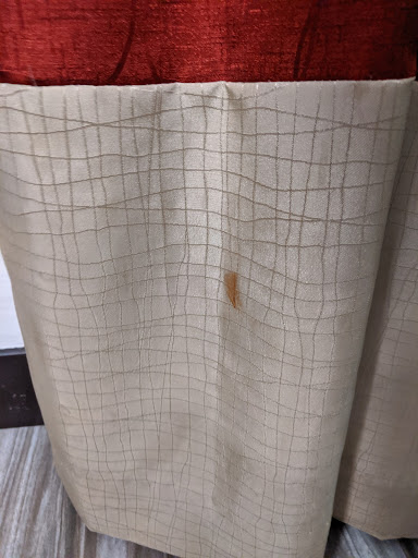 --- The hotel room was not at all clean, with the curtains spotted with stains, sticky residue on many of the fixtures, toothpaste splatters on the faucet and mirror, and dried nail polish on the bathroom counter top and in the tub. The sheets seemed clean, and we were so exhausted by that time (40 hours of traveling with almost no sleep), we decided to sleep and touch absolutely nothing else.