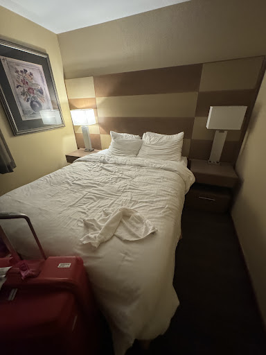 CONS: The foyer is dark and it's always empty and there's always like chairs piled up, or lights turned off or a trolly just sitting in the middle of the room or in front of the elevator randomly...feels very abandoned and not great. ZERO security features. Our room key stopped working randomly and we just went to the desk and said hey it's broken and they fixed it, but asked ZERO security questions or anything. Like, anybody could just walk in there, say a room number, and they'll apparently just give you a new key...so we always took our valuables with us at ALL time, which isn't great if you end up getting jumped or mugged. Dated room. Carpet was dirty and dusty. Lamps were dusty. The floor wasn't finished!?!? (See picture) there were huge gaps like that all over. Yellowed wallpaper, dingy and peeling everywhere. Bedsheets had red on them that looked like blood!?!? 🤢😵 Ended up going to Target and buying our own sheets, blankets, pillows etc. Drawers were gross, dirty and stained, did not want to put ANYTHING in them. No fridge, so had to keep ANYTHING we brought home like a drink or something by the open window to keep it cold, but had to be SUPER careful cause the screen was broken, so it could fall out! Some of the plugs were broken and didn't work. The bathroom was old and yellowed but clean. Didn't want to stay and check out the food considering how everything else was.