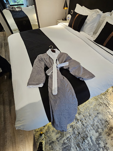 The room itself is much smaller in person than what is presented and stated on the website. There were small nicks on the furniture, dirty baseboards, stained rug, and an unfinished/patchwork ceiling in the bathroom. Every so often, the toilet would cease flushing and continue circulating water for long stretches of time. The sink hardware was wonky, and it would take a while for hot water to start coming out. The hot sink water would be cloudy and not clear. These sorts of things are not what you would expect out of a room that is nearly $300 per night, regardless of its location.