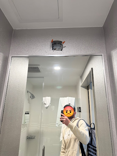 In our room, we encountered multiple maintenance issues. The air conditioner only worked when the window was open, which was uncomfortable given the freezing temperatures outside—likely a design flaw. Additionally, several lights in the room didn’t function, and the shower door wouldn’t close fully, leaving the bathroom floor soaked after every shower.