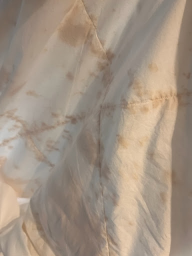 The biggest problem was the comforter. I didn't notice this the first night as it was late when I got into bed, but the next day when the comforter was backlit with light, I was extremely disturbed (to the point that I became a little nauseous). There were red blobs and spots all throughout the comforter that looked like blood or some other kind of stain.