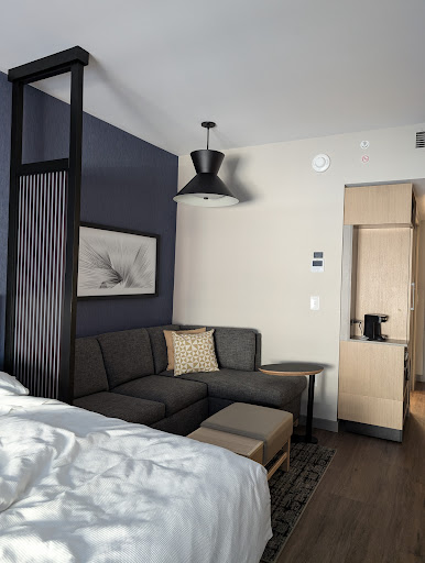 Read moreThe newest and best location for a University of Delaware hotel, right in the heart of Main Street and walkable to restaurants, bars, shops, and University buildings. There's a wonderfully well lit parking garage below the hotel that adds to the convenience. The vibe is urban, new and hip. Enjoy a free breakfast and/or cup of âď¸ in the morning, too. The rooms aren't huge but they're perfectly comfortable with a little couch, two spots for suitcases in the two double bed room, and modern bathrooms. The floors only have a little area of carpet by the couch and are mostly what I think was laminated wood which is smart for cleanability. There's a great outdoor area with bar service that was hopping on a Friday night. It's raised from street level, so while you're overlooking Main Street, you're not at sidewalk level. There's a lot of seating, a gas fire pit đĽ and gas heaters. The one downside to our stay was the length of time it took to check in. We waited for 15 minutes while two people worked on one party at a time. It was a busy night but it seemed exceedingly slow đ. Beyond that,...