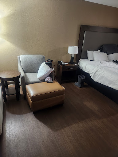 Read moreDecent stay overall. Stayed here the end of December for 3 nights. Great location. This area is full of restaurant options and shopping stores like Old navy, Walmart, target, tj maxx. Easy to access the hotel. It's an outdoor type hotel so no elevator access that I noticed. Easy check in process. The hotel lobby was clean and nicely decorated. The room was clean. My only complaint was the bed. It was on springs and squeaked WITH EVERYMOVE - it was soooo annoying. I had a king sized bed room - it had a chair and ottoman, desk and chair, small flat screen tv, mini fridge and microwave, armoire, outside of the bathroom area with sink and full sized mirror and enclosed bathroom with sink and stand up shower. The shower was set up weird to me. It had a sliding glass entry but you the opening was furthest away from the shower head so when you turned it on you had to reach in awkwardly to turn it on. The shower didn't have a place to set your stuff up. It did have the wall mounted shower pump for body wash and etc. The room had plug in chargers but doesn't support USB port charging only (just FYI)