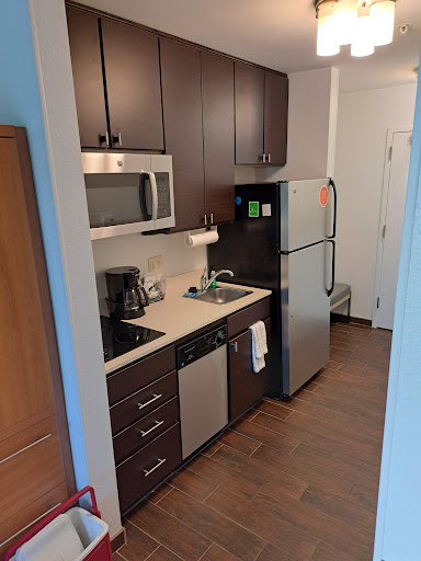 I give this place 3 stars because it's just ok. Had to be here for 8 days due to being close to Cancer Centers of America. We needed a hotel with a kitchen so we could cook decent, healthy meals. The room itself is cozy!! The closet is very strange. It has a door in kitchen and then in bathroom for access. The choice of closet organizer is weird and not very useful of space. The only dresser in room has two drawers. There is a large eat at table with four chairs which was very nice. Only one side chair. So if you wanted to watch TV, you either sat in the one chair, a dining table chair, or the bed. There were 3 of us for 8 days!!! The kitchen sink was ridiculous!!! Too small to wash a pot and the faucet came out so far that if you did try to wash anything the water ended up in the floor or on you. Seriously had to wash some dishes in the bathroom sink which is bigger than kitchen sink and even rinse some under the tub faucet!!! No table beside the one chair to do work over 8 day period. The dish washer is very small so washing pots or large dishes wasn't an option. The breakfast bar was ok, but nothing to brag about. Everyday...Frozen egg omelets, frozen fried egg, scrambled egg and every other day either turkey sausage or Canadian bacon except for one day...pork sausage. Very mundane and thrown out in hot plate to eat. Doesn't seem to be any effort or pride put into the food. They did have a great assortment of yogurt and oatmeal toppings, cereal and the usual waffle station. Maybe I'm spoiled by staying at homewood suites, but unfortunately there isn't one close by here :( . The pool was pitiful as well. One umbrella for entire pool area, no towels out, bugs and leaves in pool. Also, had to go to front desk to ask for TP for our room. That was a first!!! Overall, the place is clean which I do appreciate, alot!! The front desk people are very nice. I would stay again ONLY because I would have too for the local health care and needed a kitchen but not by choice. I've stayed at the local hampton in and it's so much better but they do not have kitchens!! The best thing about this hotel is its VERY convenient and away from busy main roads so you get a sense of relaxation and security. I just wish more thought would've gone into the set up of the rooms and the breakfast bar. That would bring this to a...