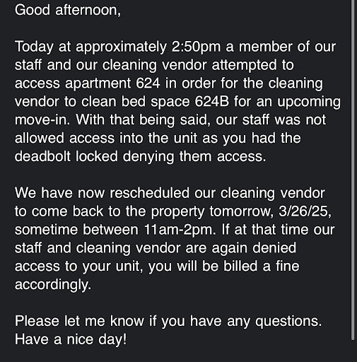 -I would love to add how they never answer the phone even the emergency hotline number you have to leave a message on. My hit water was kit working for 3 days I had issues with my tinier not flushing but yet they still charged my account $300 two weeks before leaving the premises confused on why this is even possible.
