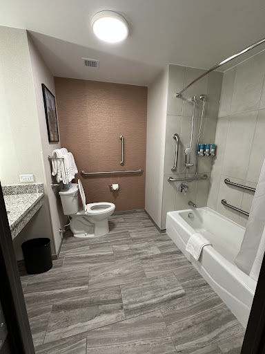 We needed a room near the convention center, last minute. We booked 15mins before checking in. The hotel is new. It is really nice inside. The lobby/eating area is giant. Many different seating options. Free water and coffee all day. The free breakfast was delicious! Even after eating it 5 days in a row, lol. They offered waffles, pancakes, potatoes, eggs, sausage patties, delicious biscuits, gravy, yogurt, boiled eggs, yogurt, bread/bagels/muffins, cereal options, grits, bananas, oranges and 4 juice options. The best perk, which we were unaware of was free appetizers/snacks every night 530pm-7pm. It included 3 free cocktails, beer and wine!!! This was not Snacks, it was a full on dinner that rotated during the week. It always had hot dogs, nachos chips & cheese, salad, soup and soda. One night it was tacos, with ground beef(think Taco Bell), black beans, rice, corn. Another night it was grilled chicken, steamed veggies, baked potatoes, pasta and Alfredo sauce. Another night it was pulled pork sliders, mac n cheese, beans and chili. They had free popcorn & soda nightly 4pm-8pm. The outdoor pool was super nice, especially with it being 90° out, it even had an outdoor hot tub which guests used in the hot weather. Part of the patio was covered with ceiling fans and offered tables & chairs. There was an outdoor bathroom which is so convenient. The staff were all super nice, especially the manager. We were sad to leave. No other hotel has exceeded our needs or expectations like this one did. Beds were super comfy, except pillows are too fluffy & get instantly flat when being used. We didn't hear people around us. Super amazing shower and water pressure. TV only went to volume 63 and was not loud at all so we added CC to read the words. We only want to stay at Drury hotels...
