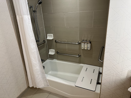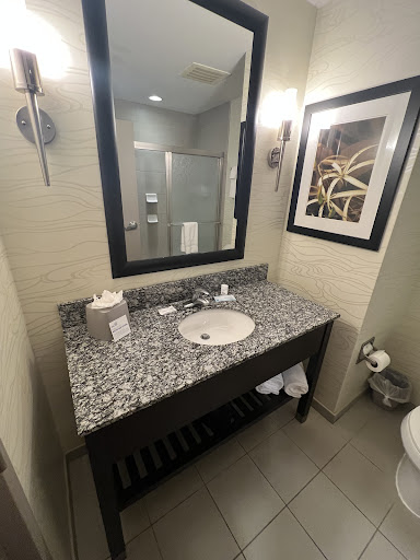 Last but definitely NOT least, our room: As soon as we opened the door, the first thing we noticed was how ABSOLUTELY great it smelled. Not a single weird odor or foul smell. It smelled like fresh linen and baby powder or something. Idk but it was nice to walk into whatever the smell was. We had a king bed. It was made very nicely with 4 nice sized pillows. Embroidered on all 4 pillow cases were either “Soft” or “Firm” which I thought was a nice touch. The linens were all white and very, very clean. Two cute reading lights were on either side of the bed. There was a nice mini sectional. One side was the size of a normal living room chair, the other was a chaise lounge. Super comfy! All tables, desks and end tables were very clean and not scratched up or damaged. There was a nice keurig, and a total of 4 nice lamps as well as a microwave and a hidden mini fridge. There was a NICE 55 inch LG tv. Probably the biggest I’ve ever seen in a hotel lol. It had DirectTV. The bathroom was remarkably clean! Even in the crevices (yes I checked on the sides of the toilet lol). I was so happy. Bc who wants to shower in a gross looking bathroom?? There are bottles of DOVE shampoo, conditioner and body wash (not those lil cheap bar soaps and generic body washes and shampoo and conditioner).