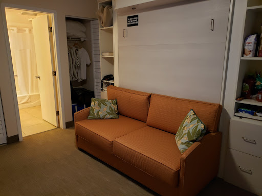 This Interval International (aka: II) Exchange, at the Redington Ambassador (aka:RA) was the smallest most uncomfortable room. II said it was a suite w no bedroom( In past stays, this turned out to be a comfortable hotel-sized room (w/ one or two beds plus a small kitchen & bathroom). NOT this time. RA put us in a tiny third bedroom attached to a much larger suite that was locked off from our room. Our room was under 300 square feet (total!). It was so small that we couldn't even open the entry door while sitting at kitchen table. The refrigerator was a college dormroom size. And kitchen sink wasn't large enough to wash a full plate! The one window looked over a parking lot w/ a portapotty and work trucks below. We asked to be upgraded to a larger room (before we checked in) & were told upgrades must be done through II . II claimed upgrades were up to the location. The next day we went to the office front-desk to check in & request a larger room. The woman argued that they were FULL (&, if we upgraded, it would cost the full $1500 for the week). So we just remained in our tiny claustrophobic room. THE WOMAN LIED. Over the entire week we counted 6 unoccupied rooms just on our wing!). And the suite that we were attached to was one of the unoccupied rooms! This empty spacious suite was attached to our tiny one (see pic w open door to suite on left and open door to our room on right) . We looked inside to see an actual living room space, a kitchen & two bedrooms (Our room was the size of the smaller kid-sized bedroom in this room#107-suite ..their bathroom was even larger than ours. Not only did the woman lie about availability, she acted like RA was doing us a favor by 'allowing us' to stay w/ them. I even had to plead for an extra pillow since she said only one pillow per guest was allowed. My husband asked if they had an ice machine (since our refrigerator's freezer's ice tray only makes 6 small ice cubes!), & she curtly replied "We don't do that". The Murphy Bed's wooden frame (our only bed) was too large for the tiny room, giving us little space btwn the frame & dresser, which meant us banging our shins on the corners. I still have multiple bruises on my shins (ouch!) My husband's only positive statement was that the towels were so rough that they were good back scratchers! (fyi: The one closet, for clothes, wasn't big enough to fit a regular-sized suitcase. Other closet was for AC and utilities....Hence, the suitcase had to be put on dresser and next to bed) Location was fine. It's just walking distance from the beach like most of the places in the area. There were plenty of avaibilities (probably due to the Red Tide making the water still unswimmable & the air, when the winds blew, made us cough. I would highly recommend AGAINST STAYING @ the Redington Ambassador. Personally, I wouldn't become an owner to such a place (since I believe you're only as good as the way you treat your guests. And theirs was shameful.) Interval International.. since you claim you aren't aware of the exchange room sizes & condition... I am letting you know. You should take them off your list of exchange locations. This room was rediculously tiny, the woman lied about availability for upgrades and the one worker, in the office on Sunday & Wednesday, treated us like we were an annoyance. There are hundreds of places to stay in this & surrounding areas. I'm certain there are more gracious & accommodating ones in which to stay. I would've given this room '0 stars' w/ review if it were accepted. Better reviews are either Owners or paid reviewers. Stay away from this place. (Note to II: I have many people ask me if I am satisfied with Time Sharing and is it worth buying in with you. *I was exchanging my spacious suite w/ a kitchen & 1 bedroom in AtlanticCity, NJ...w/ views of the ocean & harbor. If this is what you offer, for exchanges, then what do you think I will tell them?) 0ct 27...