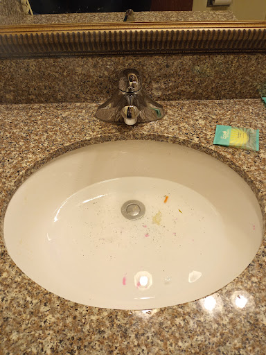 However, the stay was not without some nostalgia. In college, I lived in a rented house with eight other guys. This hotel brought me back to those days. Orange mold on the shower curtain. Sticky, moist residue on the carpet that seeps through your socks. Ash burns on the blankets and sheets. Drywall screws poking out of the walls just waiting to grab you and never let you go.