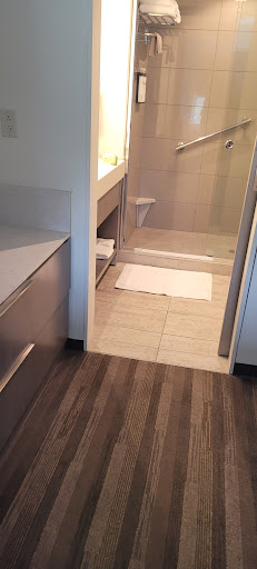 Bathroom had walk-in shower stall with a glass door. Very easy to step in. Pump bottles of soap, shampoo, and conditioner were mounted inside the shower for easy use. Nice long mirror in room outside of bathroom to check your outfit.