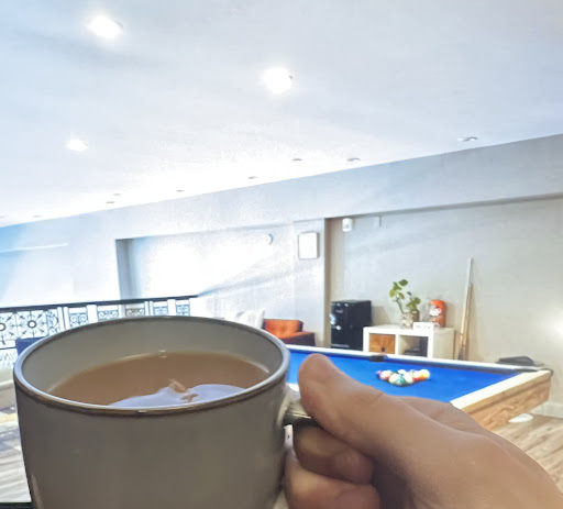 The common area is cozy and well-designed, with couches, a pool table, and really solid coffee (served there, not in your room). The bed was comfy, the shower hot—though the water pressure could be better.