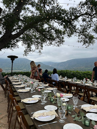 My husband and I just got married at the Ojai Retreat and Inn. It could not have been a more perfect experience. The retreat center is beautiful, situated on the hilltop overlooking the Ojai Valley and the Topatopa Mountains for the perfect view of the famous Ojai pink moment. We did a full venue buy-out and had our immediate families stay on the property. It was delightful enjoying the grounds, watching the birds and rabbits, and admiring the stunning views. The retreat center provided us breakfast every morning so we could visit together and enjoy a delicious meal without having to go off property. There were plenty of areas to visit and catch up, from the scenic Mountain View Terrace to the Living Room at night and when it was raining. There are three separate areas we used for our ceremony, cocktail hour, and reception. Each was the perfect location for what we needed it to be. We chose the Pink Terrace Amphitheater for our ceremony, with a stunning view of the mountains. The Waterfall Garden kept our guests surrounded in beauty while my husband and I took pictures in the Meditation Garden during cocktail hour. And the Mountain View Terrace was the perfect place for us to enjoy dinner and dancing under the string lights by the outdoor fireplace. Our guests came from all over the country and kept admiring the view and saying it was God's Country. It was like something out of a fairytale!