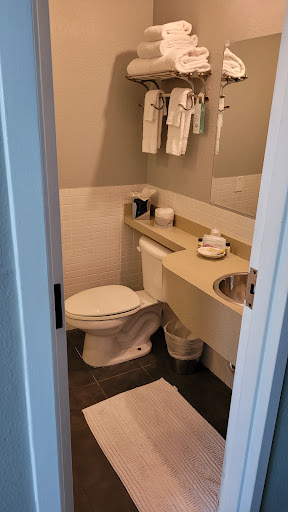 When we walked into the room, we noticed the overwhelming smell of bleach & the slight dampness in the air. Our room had really gross, dark, mysterious carpet & painted tile floors. Yes, paint over tile. Very odd choice. The doorframe to the bathroom in our room had disgusting rust stains corroding through paint. Very unsightly. The side tables next to our bed were really badly scraped-up. The floor in our room was not level. The second night in our room revealed a mildewy smell instead of bleach as we walked in the door. When I got down on the carpet to look for something that fell, I realized that the dark, mysterious carpet was what reeked of mildew. I genuinely can not tell you if I prefer bleach or mildew scent better, but I do know that neither are a good sign in a hotel. When I woke-up on Sunday, I wished I had booked a full-service hotel, instead, because breakfast in bed would have been a nice treat. The bed was actually comfortable, so that was a saving grace for the stay. The bathroom towels, however, unacceptable. As soon as I used one I thought... polyester. I read the label & it was, indeed, a cotton blend. Weird. Never used a towel that wasn't 100% cotton before. I hate the blend.