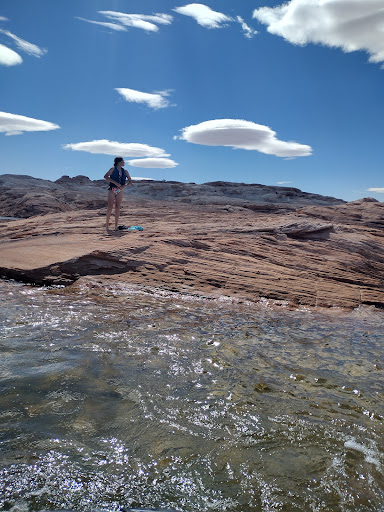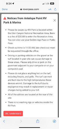 Read moreAbsolutely Disappointing!! Zero amenities. No lake access, unless you want to wait in a 1 1/2 hr line with all of the boat rental customers to be brought down to the marina in a golf cart. The RV park itself is a weird, plastic, exposed lot atop a tall retaining wall above the upper marina parking lot. The wind exposure is almost unbearable, our RV was getting blown all over. There are NO tables, no fire pits or living plants at any sites. There is turf, which is nice. But no shade. NO bathrooms, NO laundry, there’s not even an office! Just a 10 ft shipping container where a host will check you in, but is never around. The hook ups are badly designed. The sewage is at the very back corner of the long narrow space. We had to use three hoses to hook up. And we had to park way over to one side, almost on top of the turf, in order to open our slides and not hit the electrical box. It’s a 25 minute drive to town for any amenities, including beach access. That on top of the obscenely high nightly rate for a zero-amenity campsite. I would pay $40/day just for the close proximity to Antelope Canyon and the wonderful Antelope Point Marina shops, restaurants and boat rentals. But $70/day is absolutely ridiculous until they install basic amenities like tables, laundry...