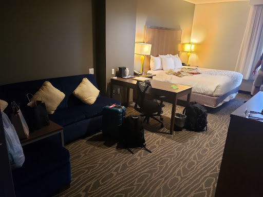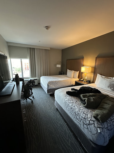 We don't typically stay at La Quinta Inn; usually we stay at Hilton, Hyatt or Marriott. Unfortunately any nearby or in Page were booked so we went to La Quinta and were presently surprised. The lobby has ample seating for guests with a variety of chairs, and a nice TV. There's also a pool & hot tub which are outdoor and close at 10p.m. which was the only downside to those for me. We were able to do laundry here using guest laundry on the 2nd floor which is open 24hours. Due to hiking and the heat that was a necessity for us and was a huge plus that it was 24hr. So we didn't have to work a daily schedule out around when we needed to do laundry. Laundry is coin laundry which you can get quarters from the lobby if needed. The rooms have neat peep holes that I tried to capture for potential guests to see. You don't have to lean in because you're able to see what's going on outside the room from about 3 - 5 feet away with the type of peep hole the rooms have. The hotel and room we stayed in was very clean. The location is also fairly good - about 5 minutes from the Glen Canyon Overlook and about 10 to Horseshoe Bend. There's also Wal-Mart, KFC, Burger King, McDonald's and Starbucks within a 7 min drive. The shower gets HOT 🔥 which is great ,some hotels we've stayed in on our roadtrip get warm but this shower got steamy which made it feel like home and there's a microwave and mini fridge in the room also. Overall we really enjoyed our stay in this room and if we come back to Page would stay in this hotel again.