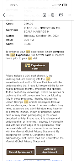 Read moreThis spa is pretty. A little dated but has an abundance of good features. The problem is, I didn’t get access to them. I scheduled a massage for 3:00 expecting to have a few hours, according to the hours listed on line, to enjoy the sauna’s, steam room etc. I arrived about 2:30. The front desk person asked for my payment in advance. Weird but ok. I got a nice tour of the facility, showing me the cafe where I could purchase food, steam rooms, pool and sauna, along with the relaxation lounge. I changed into my robe and then waited to be called for my massage. The seasonal massage was just ok. I also opted for the extra head massage with oil. It was terrible. Not relaxing at all. He was practically scrubbing my head and so quickly I had to ask him to stop. Left the message room to find the stream rooms were off, two other guest were confused as well. When I finally asked the back attendant she said “oh we close at 4:00”. Not one person mentioned this! Not the person checking me in, not the person confirming my appointment, not the tour guide. The attendant saw the disappointment in my face and quickly offered a pass so that I could use the facility the following day. I think that would have been nice. But when I left, I asked the other attendant about the pass, she proceeded to tell me that I should have known the hours. She huffed and signed making me really feel uncomfortable about asking for the pass. She gave me the pass, but honestly, I felt like it I showed up with it I was going to be met with pushback. Customers be weary! I love a great spa day, but this place isn’t a place...