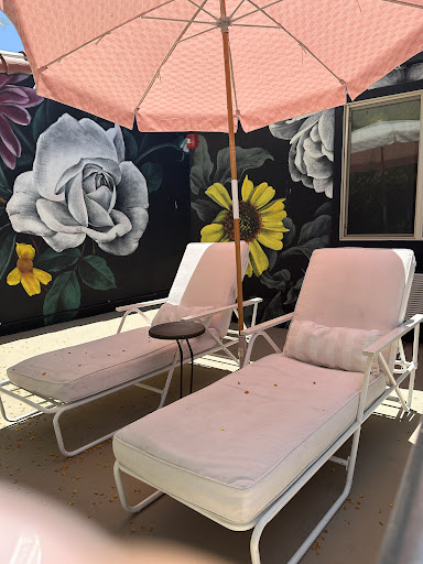 Read moreWe had a great time at fluer noir. The decor is so beautiful with the huge floral murals and floral wallpaper with lots of pink accents. Many fun extra like use of pink bikes with baskets (until 6 pm), an all day kitchenette offering chobani yogurt, la croix seltzers, fruit, coffee and snacks like bars and pop chips. The pool is heated to a nice temp and there are plenty of comfy lounge chairs. Nice fire pits at night too. The double bed rooms are spacious with a kitchen area two large queen beds and a big enough bathroom/closet. They offer Malin & Goetz toiletries adhered to the wall, smell great. Sink area is small but there’s a little side table for your toiletries. Plenty of very hot water from the showers with a stone tile floor. Towels could be softer, they’re getting pretty rough. Note some of the rooms are very close to the road, only separated by a hedge and you can hear street traffic starting early….what you will not hear is other guests too much because quiet time is at 10 pm. WiFi is the one major negative, it’s very inconsistent and there would be no way to work remotely with this WiFi. ||Location is convenient to main shopping street in town and lots of restaurants. It’s about a mile plus walk to the center of things and there are wide sidewalks. Parking is available behind an automatic gate, never had a problem getting a spot but can be a little tight with large cars. You can also walk over to a gorgeous neighborhood with mid century homes including the home featured in Don’t Worry Darling. If you’re in town on a Thursday night be sure to go to the Palm Springs festival where several blocks are closed off for restaurants, crafts, food and jewelry. You can walk from the hotel. ||The service is awesome, Bri is super helpful and accommodating. She’s got all the tips on the best lighting for pics, how to use the bikes, and is super generous with using the property after check out while waiting for a flight. I recommend fluer noir for friends, couples and adult families. Good...