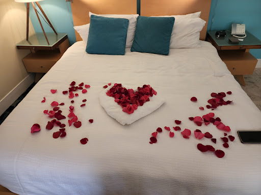 Read moreThe good : It's a small hotel with less than 30 units, can't remember the exact number. I personally like that. It is an adult hotel, no kids allowed. Perfect for a weekend get away for you and your partner. We stayed here one night for our 1 day staycation/anniversary. Nate was awesome, I had to go in to drop off flowers, he set them up for us, made a heart of rose petals on the bed. My lady loved it! The room was clean, the bed was very comfy. Best of all tho, they had the temp set to 70. It's palm springs in the summer. So 110 and above is very common. They had wine and cheese in the afternoon, and a free breakfast snacks in the morning. Pool and jacuzzi looked clean, we didn't use them but saw other guest enjoying their time. Overall the experience was great. We got in at around midnight after a night out. The 70 degree room, along with pillows and blankets, allowed me to sleep till 10 am. I usually don't sleep more than 6 or 7 hours. The bad: Our room had a balcony, they have some tall bushes for privacy from surrounding properties. The balcony was full of leaves, not that big of a deal, maybe we just arrived on day 5 or 6 after the gardener had cleaned up. Although the bathrooms and showers were very clean. The toilets were small. I couldn't fit in them lol. I'm 245lb 5foot 10, so I'm not a huge guy. The toilets were just small. Overall: Free wine and cheese, free breakfast snacks, nice pool, great staff, great location in downtown, for a decent prize. Overall this was an amazing hotel to stay at. And would definitely be staying again here when we need a night away from the kids. 10 out 10...