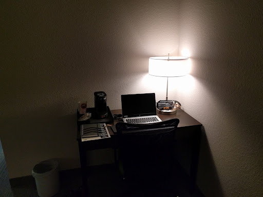 No working exhaust fan in bathroom. A trickle of Hot water pressure In sink. One hanger for two people and a real effort to get staff to find another one. . No paper or pens available in room. No operating instructions for TV. Non-operatable coffee pot in room because of missing part. No elevator for second floor. Nothing fresh available for breakfast as in pictures posted on website. No pool No night staff When inquiring about accommodations in order to make a booking was told only two rooms available in the whole hotel. But at night and in the morning, there were no more than three cars in the whole parking lot. No one Rate was about $30 higher than Americinn. Was in town...