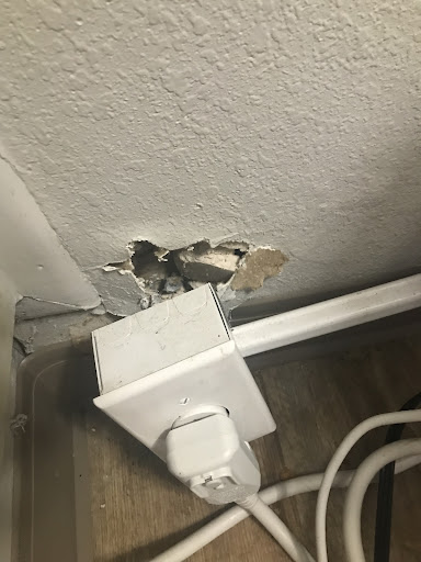See the photos of the not-to-code issues: electrical connection for heater-A/C unit pulled out from wall, and the filthy exhaust fan that was missing the safety shield.