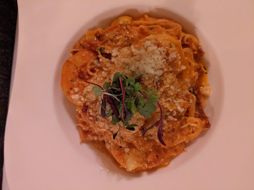 For my main course I had the flat iron steak that I asked for medium rare and it was cooked to perfection...something many restaurants seem to get wrong on such a thin steak. It came with some veg and mashed potatoes that I though at first were sweet potatoes but were actually mashed potatoes and pureed red bell pepper and spices. Hats off to chef Justin for not only making the food delicious but also visually appealing and that much more special.
