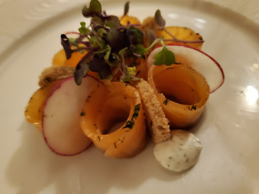 Read moreAmbience is very well executed. Food was a mix of stellar and poorly prepared. Salmon appetizer was very nice. I have to say that the salad was a perfect mix of tart greens, silky dressing and crispy bacon. My entree was a lamb wellington that was disappointingly soggy with vegetables that were not cooked properly. All the rest of the food was quite good as was the service until the server brought us the entrees........my employee ordered filet and he received short ribs. He made her aware of the mistake when she sat both of the plates down (mine was right), but she left us to check. She came back, took my fork off my plate and took both plates, for what I would assume would go back to the kitchen. NO NO SHE DIDNT. SHE DELIVERED THE TWO PLATES TO TWO OTHER PATRONS ON THE OTHER SIDE OF THE RESTAURANT!!! I was so stunned i didn't say anything. Still stunned. We moved to dessert and we ordered an apple that wasn't an apple. A white chocolate shell full of apple dessert that, I was told, was an otherworldly experience. My dessert was smores served outside at the fire. How cool right? So I started to go to the fire. No. The waitress started the fire and rather than take the dessert to the fireplace she makes me carry the rather large plate outside. She gives me no napkins and I sit down in a chair and it is full of the days rainwater. How unreasonable of me to expect that she would dry off a seat or two for us at a restaurant where our dinner would be $300. Nope. It has great potential but it seems operations are a little sloppy. The owner of this establishment would be mortified by ny experience and further mortified to know of my position since they are a AAA 4...