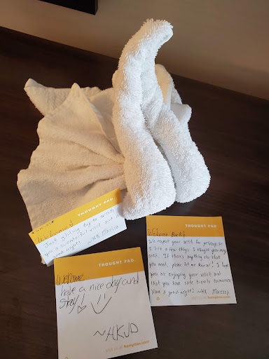 -day 1, I was checked in by a friendly staff member who appeared to be on her first day...she was also dealing with police who had been called on some guests, and a rather rude man on a ladder who was doing some work on a ceiling vent with very loud tools. We could not hear each other and the poor girl was fielding a phone call at the same time, which she could not hear. -successfully checked in, room smelled like dirty laundry. I later identified the old wrinkled shower curtain as the problem. I lived with it. -Day 2 locked out of my room after breakfast...key not working... and nobody was at the desk to assist after ringing the bell for 20 min. The hotel phone rang and went unanswered several times as I waited. I finally flagged down the breakfast worker who didn't know how to log in. Eventually she had to physically go to the Tru Hotel next door (same ownership) and another 15 minutes later a nice man reset my key card. I had now missed the 8AM tour that was the reason I was even at a hotel. -I noticed an email from Hilton Honors a bit later saying my 3 day prepaid reservation had been canceled...I called Hilton Honors to find out who canceled... 45 minute phone call! HH talked to the mgmt of the hotel and discovered that it was the hotel who canceled by mistake. I was concerned they would remove my property from the room while I was out, but I was assured it was fixed and that I would keep my same room. -Later that afternoon someone tried to enter my room with a key as I showered. I had the security lever in place (thank God). They then knocked and shook the door several times. By the time I got to the door they were gone. I went to the desk, nobody there again. Day 3, locked out again. Luckily, there was a nice young man at the desk who informed me that my reservation had been canceled...again!!! He listened patiently and logged in to make sense of what had happened. He was able to find my original reservation, acknowledged the absolute **show I had endured at this Hampton Inn, and offered to comp my stay. (I didn't ask to be comped.) At this point in time I have not been refunded anything from Hampton Inn. Hilton Honors gave me 500 HH points (nothing really) and they questioned whether this hotel should be part of the HH program at all. He told me Hampton Inns are for truckers! 😆 -So I will patiently await my refund or partial refund, although not holding my breath. I'll revise if it ever...
