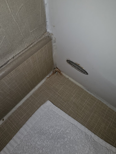The bathroom was gross. There was black mold growing in the tubs of both rooms. The walls had water damage and drip stains coming from the ceiling. The floor had hair and debris on them. The bathroom floors were sticky. The toilet bowl seat was dirty. Thank goodness we packed Clorox wipes. The carpet had a damp feel, smelled moldy and sticky.