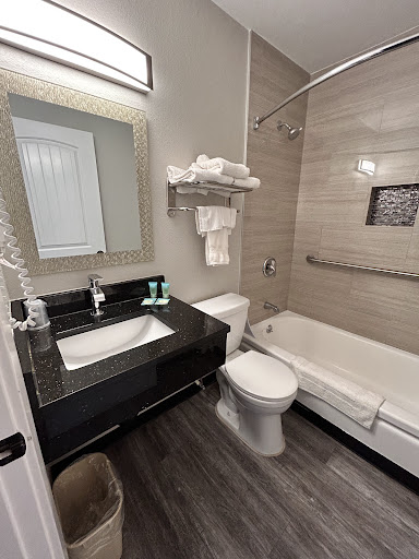 Read moreWe arrived pretty late in the day but there weren't any issues. The staff that checked us in was kind and he got us set up right away. At first, I was slightly surprised at how small the room was but that's only because I didn't read what the square footage was and I also didn't care at the time because I was looking (very last minute) for a place that was affordable but also not grimy and filled with bad reviews. I also was comparing the size to other places we've stayed at but it was just my husband and I so that didn't bother me the rest of our stay. (Had I booked ahead of time, we would have gotten a more spacious room) The room and bathroom itself were all very clean with no stains or markings. There weren't any lingering smells, the ac/heater worked efficiently as did the TV and mini fridge. The decor, furniture, appliances were all modern, nothing looked like it was from before the 2000s. The location was perfect because we were right in the middle of all the places we visited as well as in walking distance of places to eat and downtown. I gave five stars because we honestly enjoyed our stay for it being a very last minute booking. I'd definitely seek this lodge out again...