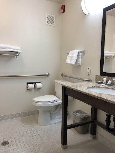 As for accessibility - the bathroom was done fairly well (pics included). There were several grab bars, a heavy but useable shower seat, detachable shower head, bathroom counter that worked for a wheelchair, and several fire alarms with lights scattered around. The room itself seemed to have zero thought put into making it accessible. It’s the smallest accessible room I’ve ever stayed in and difficult to get around. The beds were tall and very hard to transfer into. It was difficult to turn around when backing away from the bed and you’ll most likely run into things trying to do it (I have a pretty small chair). And their choice of carpet throughout the whole hotel is a kind that requires a lot of strength to push on if you don’t have a power assist or someone to help.