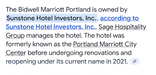 Read moreWe recently spent a few days at this hotel. My husband is a Titanium member and we are frequent travelers, however, this was my first time in Portland. When we arrived at the hotel late at night, there was a young man dressed completely in black and leaning against the building. We thought he was a panhandler and tried to avoid him by going through the other doors, but they were all locked so we had no recourse except to pass him by and go through the only unlocked door. It was at that time that he moved a bit and we could see the word "Security" on his back. As we passed him he didn't say one word to us but passed us by as we all walked into the lobby (he disappeared somewhere into a back room). We asked the desk clerk for an upgrade with a view and he told us those rooms were on the 18th floor. When my husband asked if they (the upgrades) had king beds, which is what we reserved, he said they did not, only doubles, which seemed hard to believe. I asked for a room with a bathtub, he said since the renovation, all of the rooms have tubs. He gave us a room on the 15th floor and he said it had the best views of the city. When we arrived in the room, I immediately looked in the bathroom, there was no bathtub. I turned on a light by the bed and saw a "deodorizer tree" hanging from inside the lampshade. It's the same tree a teenager might hang from the rearview mirror of their first car. I then saw another tree hanging above the room door. Both trees had printed on them "little tree, new car scent". I put 2 and 2 together and surmised these car deodorizers were put in the room to neutralize the smell of pot that undoubtedly often permeates since it is legal in Portland. Our view was nothing to write home about. We looked into vacant office buildings and into someone's apt. below. If it was the best view of the city, I can only imagine what one might see from rooms on the other sides of the building. The room was mostly clean, although it seemed that the floor had not been swept before we arrived. It was otherwise bland and somewhat "cold," not particularly welcoming. The shower had a weak water output so I held off washing my hair thinking I would need more time than I had to get all the shampoo rinsed out. The Marriott lounge was decent but, again, nothing outstanding. The people we met at the front...