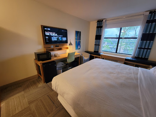 Read moreCheck in was fast and friendly. Every time we had a small issue, the staff responded quickly and with clear explanations. Parking is a bit of an issue here though, because there is a tiki bar on the property that shares the parking lot with hotel patrons. We couldn't find a spot one night when returning to the hotel, so we told the front desk and one of them went out personally to take a look. Turned out there was no one monitoring the hotel-only area. Whenever we had a question, they answered it too. Very friendly people all around. Minor complaints re: the room - we asked for a corner room or one on a high floor, but we got a second floor room with a view of the parking lot and the place was booked so we couldn't be moved. Secondly, there was a scrunchie with hair in it on the bathroom floor which shouldn't have been missed by the cleaning staff if the room had indeed been cleaned thoroughly. It just puts doubt in your head. But the room was modern and clean with a refrigerator, which we liked. The Breakfast-for-a-Buck promo worked out okay and the servers were very nice, but the breakfast was always the same and kind of slow coming. No complaints though overall. The biggest concern to us was the pool area. We like to go for an early hot tub visit and then some time at the (very nice) pool. However, late night pool patrons leave a big mess of liquor litter, wet towels, and even underwear, but no one cleans it up before morning patrons arrive for a swim. One day we found two homeless people with all of their belongings sleeping on the cushioned lounge chairs in a private pool alcove. They even stayed while we enjoyed the pool. Later, we told the front desk about it and asked if they have a camera on the pool area, but they don't, and upon checking, we found the gate to the pool area was unlocked overnight, hence the visitors. So the pool area was lovely, but not well maintained, however the water temp and clarity was beautiful. Check out was quick and there were no added charges at the end, but the room was clean when we left. The room was modern and bright and cool enough to sleep well. The bed was very comfortable and the TV and everything else worked just fine. We could have used some luggage racks though, as we had to put them on the AC set up, blocking the air flow. We also did not experience any real noise issues, even though there was a room full of students across the hall. Weird that there WAS an abandoned microwave oven on the floor outside a room opposite ours...