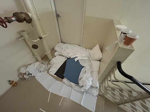 As soon as we arrived, I went for a walk around the hotel looking for where the fitness center, pool, breakfast etc was. The fitness center was hard to find off signs alone; you have to go to the back corner and use either the elevator or stairs to go down to the basement. I found it and decided to go up to the top of the stairs to get some steps in (we had just drove 9 hours to get there). Upon reaching the top, I found a homeless personās setup right by the door leading to the roof. I am attaching the photo to this review, but you can clearly see bed linens and pillows on the ground, a trash bag, roll of toilet paper, coffee cups and bowls from the breakfast buffet. This person was evidently going downstairs to get breakfast and bringing the trash up to their hideout. If the crew that maintains this hotel could allow this to happen, who knows what else is slipping through the cracks?