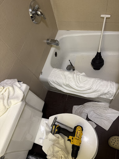 The bathroom had seen some remodeling on the sink and the toilet worked fine. The shower was still unfinished with a hole around the shower head. And the shower head was poor and sprayed everywhere.