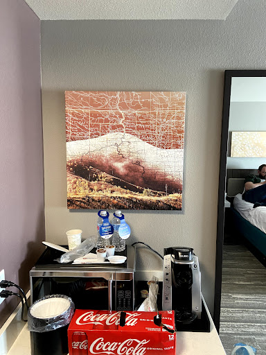 The artwork. The artwork. Three paintings were in our room, one of a bird over the bed, which was wonderful. Another of some buffalo, which was great,but it it had some weird designs across the front… But they were easily ignored. But the third painting… The third painting… What was it? Upon close inspection, yes it was plains, and a mountain, and sky with a map of South Dakota overlaid over it… But I don’t think that was the full meaning. Some of us saw a beautiful naked woman slightly turned away from you in an erotic pose… Some of us saw a slaughtered chicken, feathers ripped out, and left to rot upon the sand… it continually drew your eye. It was almost, hypnotic, in the pull it had over us…. I am including a picture. So that you too may observe and reflect… on the hidden depths of this art. I can only pray, that it does not pull you in the way it pulled us in… Also can you tell me where I can buy this?