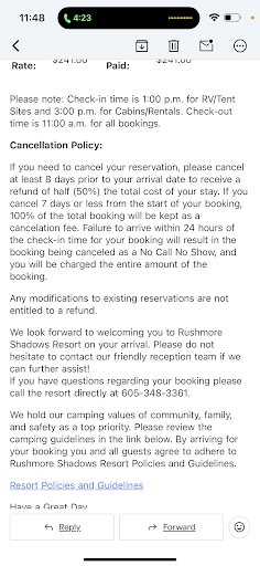 Read moreCheck-in was easy and staff was friendly. Good location for many attractions, but comes with a cost. There are many campgrounds to choose from in the area, and after staying here, we would probably pick another park. While checking in, we were provided a list of rules, but discovered this campground does little to enforce said rules. Very large park, which includes cabins and tent areas. Campground has large pet play area, mini golf course, and holds events for its guests. Wifi was weak and not reliable. Wifi only allows so many users, so we were unable to use it until other campers left the park. We complained to office a couple times, but the problem continued. DirecTV (free standing satellite) had no issue. Campground off highway 16, but we never heard traffic within the park. Gas station is less that 1 mile from the campground, which includes diesel. Roads throughout the park are wide and easy for big rigs. Super Walmart just 20 mins, away. Bear Country drive, Reptile Garden and Fort Hays just down the street. While here we also visited Keystone, Mount Rushmore and Custer State Park. Our price included a discount for attending a required membership meeting, and this is where our experience changed. A lady conducting the meeting made a couple scary comments; we were not able to leave the building to discuss or think about their membership, or the price goes up… but the most awful comment was made about the comment card we received during check-in. This lady states these comment cards are not considered for evaluation for non-members. It seems this campground only cares about members and if you are a non-member you...