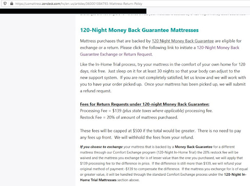ORIGINAL My wife and I purchased a mattress from US Mattress (9404507). We wanted a firm mattress. We ordered a “Serta I Comfort” that was supposed to be a level 3 on their firmness scale. The mattress that was delivered, is nowhere near the firmness of the mattress we tested in store. When looking at the paperwork for the mattress, the firmness is listed as “Medium”, which is again, not what we wanted. We went back to the US Mattress Store located near Rochester Road and Avon road located in Rochester Hills, MI to do a return. When we purchased the mattress, we were told that our mattress is covered by a “120-Night Money Back Guarantee” otherwise we would not have purchased the mattress without having a money back guarantee. When attempting a return, our sales representative told us that the particular brand/type of mattress that we purchased does not qualify for the return process and can only be exchanged one time. At no point when we made the purchase were we verbally told that our mattress does not qualify for returns, in fact, we asked if it did qualify for a return if the mattress did not meet our needs and we were told “yes, but there would be a $139 processing fee plus a 20% restocking fee of the amount of the mattress purchased”. US Mattresses’ website also clearly states this return policy and nowhere on the return policy does it say that the return policy only applies to certain brands/types of mattresses. We do not want an exchange of the mattress because we were told that it must be exchanged for a mattress of the same brand/model but there are no firmer options available that we liked. We also already purchased a mattress elsewhere that meets our firmness needs. So now we are stuck with a mattress that we are completely dissatisfied with and we are out the cost of the mattress which was over $1,000. So in closing, be very cautious where making a purchase from US Mattress as their return/exchange policy is very confusing and is very contradictory as written on...