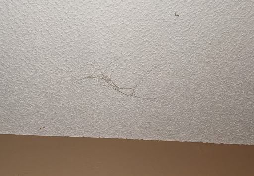 I get into the second room, immediately see black mold in the bathroom, with old, piss stained mat in the tub, and the ceiling was LAYERED in spider webs, we counted 8 pretty big spiders just on the ceiling crawling around