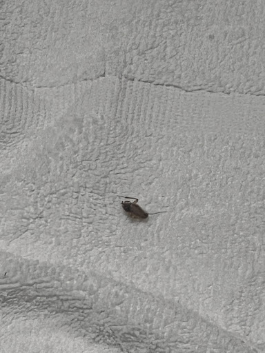 The next morning I found the young cockroach family had taken up residence in the empty dog bowl. They got in but could not get out and were running laps around the bottom of the bowl. I cheered for the smallest one, a girl, and made a brief video of the contest. Then I dispatched the roaches down the toilet and cleaned out the bowl using the Red Roof branded travel shampoo/floor cleaner.