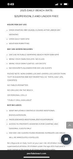 Edit: still not seeing no speakers anywhere in the rules. You may want to update it! Also, day passers left beer cans scattered all over the beach so you canât tell me they do a good job cleaning up after themselves, I seen it with my own eyes!! if I can contain my trash with these so called 30 mph winds, so can they⌠Clearly, the beach revenue is your bread & butter⌠Thatâs all we needed to know. Like I said before, we paid for a private camping experience, apparently private doesnât include the amenities.. Might as well book at a state park for half the...