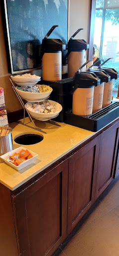 Breakfast The food display was appealing. Total we had Canadian Bacon, pancakes and scrambled eggs for the hot choice. Yogurt and cut fruit is available. The dining area is bit small, but you can take your food and eat at the various comfy chairs and couches around the lobby area. Every looks clean with the dining area, but if you a little bit closer... the window sills around the dining area needs a quick dusting... there are crumbs and other small debris sitting on them.