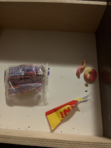 THEN, I go to plug my phone in, and there is a ring of catsup (or an undefinable red substance of some kind), as if someone put a glass in a pile of catsup and set it on the night table. And it is now dried, but not dried to the point that it is crusty, dried to the point that it has a jam like consistency.