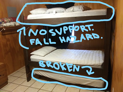 FRIDGE: was hot on the inside when we first entered our food was getting hot from the ride over. was to busy getting settled in to call the maintenance man. me being a Appliance technician got it working within 10 mins and it was blowing cold. I did not charge them for my services DOOR: was dirty and was told that the room was cleaned 2 times over to avoid Covid-19. my wife cleaned the inside door handle area with a simple Clorox wipe and the rag came out brown with dirt. outside door had rust. BUNKBED: upper part had no support rails so anybody who slept up there had the possibility to fall throughout the night. the pullout frame on the bottom of the bed was broken so we couldn't use it. (FALL HAZARD) FIRE EXTINGUISHER: no date of last time checked on not sure if still operable. no smoke detector in the room. (FIRE HAZARD) 5.QUEEN MATTRESSES: old, thin, and every movement heard. Frame holding it up was old and falling apart (FALL HAZARD) 6:OLD CHAIR: was falling apart literally. had a broken spring. (FALL HAZARD) 7:COUCH: was dirty and filthy had to put a blanket over it to sit on, arm rest were caked in body grease. also the pull out bed had crumbs, stains, and dust all over. (NOT CLEANED) DECOR: was old falling apart, sun bleached, and caked with dust. no privacy blinds or curtains in living room area for those sleeping on pullout couch due to the broken frame and bunk fall hazard. (NOT CLEANED) LIGHTS: ceiling fan and kitchen light both wired to the same switch. (FIRE HAZARD) TABLES AND WOOD FURNITURE: old and falling apart, table feet broken. I thought the place was updated??? RESTROOM: fan not working. shower head to low had to crouch to wash my hair. TRASH: found under bed. Cleaned for covid???