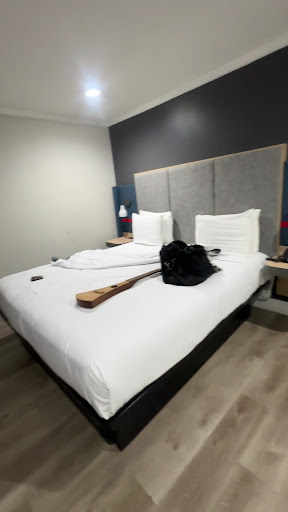 The first night in the hotel was absolutely awful! The hotel turned out to be in a really bad location with homeless people all around the corners and in the parking lot. The ENTIRE night there were people high out of their minds screaming, fighting, and slamming things right outside our room. We felt extremely unsafe and barely got any sleep that night. The next morning some folks complained at the front desk about the ruckus, saying they had called the front desk at 3am as they didn't feel safe to come out of their rooms and no one answered the phones. Ricky simply said "we have a security guard". Security must have been asleep somewhere else or just didn't care to do anything. We put a chair in front of the door and wrapped a cord around the door for some extra security. Luckily there wasn't any fighting for the rest of the stay, but it left a bad taste in my mouth. The rooms were okay, it's nice that they are ADA compliant but there is absolutely nowhere to put your things - no shelves or drawers. The shower got clogged and flooded the entire bathroom since there is no border between the shower and the rest of the room. The continental breakfast was okay, though the "eggs" and "sausage" come from a box in the pantry and are simply put into a steamer to warm up. I really wouldn't come here, its not safe to walk around at night and the staff do not care or communicate...