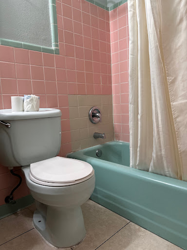 Then there's the room. Sorry to say that this is almost the worst hotel I've stayed at in about 40 years of heavy travel. I can't possibly go into each item that either grossed me out or physically put me into a state of apprehension. The room had absolutely nothing on the nasty white painted (possibly years ago) sheetrocked walls, which might not have even help but could marginally mitigate the feeling of being in a jail cell. The desk was a skinny, beat up sofa-table with a cheap cloth desk chair stuffed against the wall at the foot of the bed. (under the TV) The bathroom made me laugh. Look at the pictures, The toilet was light blue with a white seat/lid combo. The tub was blue and the walls pink tile except for the area in the tub where they used tan tiles. The shower curtain was about a foot too long so when you stood in the shower you were treated with rubbing your feet and ankles on wet nasty plastic covered in soap scum and whatever grows at the bottom of shower curtains that are always wet and clumped together. Dare I say mold? The light switch plate was melted or purposely bent so that it didn't sit flush with the wall. Not sure why but whenever I see things like that or the shower vent not covering the entire hole in the ceiling, I feel like something's going to crawl or slither out of it. While we're covering the bathroom, the door didn't stay shut, the toilet paper holder was missing the rod so the TP was on the back of the toilet, which apparently is the only place to set anything down on. The skinny edge of the tiny sink was already being used by the two towels, one hand towel, two wash cloths and a smallest bar of soap...