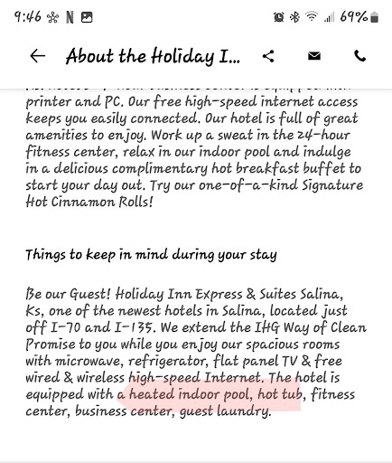 Read moreWe had a room over the weekend for a wrestling tournament. We checked in late once we arrived in Salina. The employee at the service desk seemed to be annoyed that we were checking in at 9pm. We had decided to extend our stay another night so I asked to add an extra night to our booking she said she couldn't do that because I had booked with another site and would have to go through them. I asked if there were rooms available before contacting the other site she said she didn't know.... We checked in ans went up to our room. The bathroom had hair in the shower and on the sink. We cleaned the bathroom before using it. There was not a stopper in the tub so we called down and requested one and was told there were not any in the hotel.