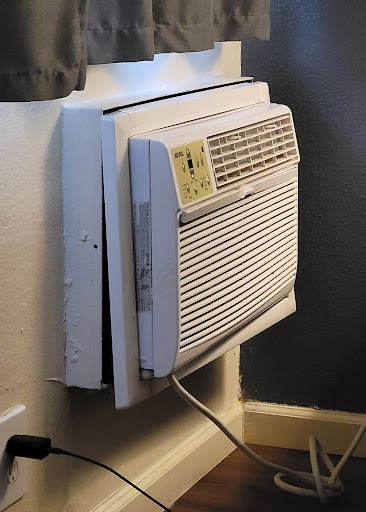 The room smelled funky upon entry. The bed was awful. Awful. Hard as a rock, like they tossed a piece of plywood on top of a box spring. We booked a room with a queen bed, and the bed we got was the size of a full, at best. The AC goes off and on and doesn't cool the room. You can't change the thermostat, so once it gets to be 70°, the AC turns on automatically. However, it doesn't cool the room. It must alter the temperature right around the thermostat because it went on and off all night long, but the temperature in the room stayed balmy and uncomfortable. It looked like it was falling apart. See photo.