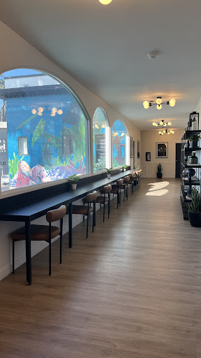 There's also a great second floor work space all along the North facing aspect of the building. It seats about 6-8 people. Lots of light and very quiet. The patio is charming as well, complete with water fall, fire pit tables, couches and a beautiful mural.