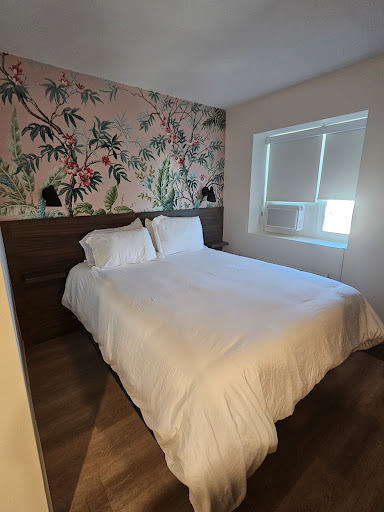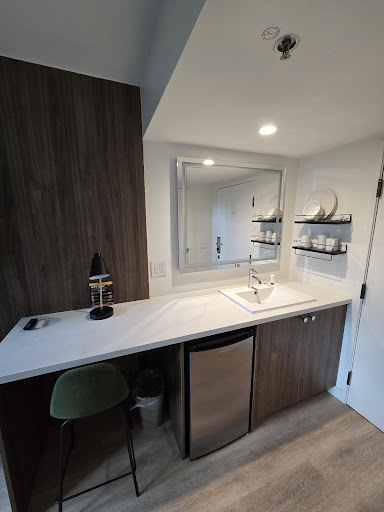 Read moreFirst impression from the outside, this hotel resembles a country's consulate with a security gate in front and a strong concrete form. Inside I was warmly greeted, given basic neighborhood information, and directed to my room. Coming and going, my impression is it may serve as a student and residential hotel. Location for public transportation, groceries, dining, neighborhood bars is as good as it gets! My room was perfect for a short stay and one adult and affordable. However on a cool night, the window unit could not warm adequately. I mentioned it at the desk and right away the attendant provided me with a space heater, so I assume that is a usual request in winter. I slept well on the quieter west side, but it is a busy urban neighborhood, so expect an occasional siren or car horn. Partway through my morning shower the water turned cool, but soon became hot again. Because of the efficient size of the room, a full kitchen with tables, a microwave, full sized stove and even dishes and cutlery are in a separate room on the floor, and if the mini fridge in the room proved insufficient there is a full sized one in this kitchen. I would stay again for the location and the...